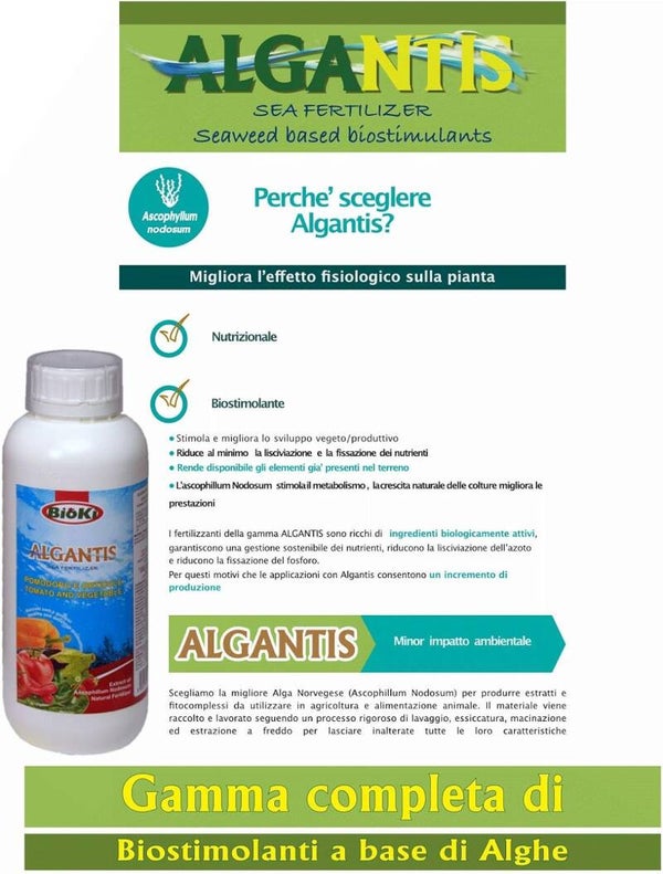 - ALGANTIS POMODORO E ORTICOLE e’ un fertilizzante prodotto con estratto di alga di ascophillum nodosum senza aggiunta di residui di lavorazioni zootecniche